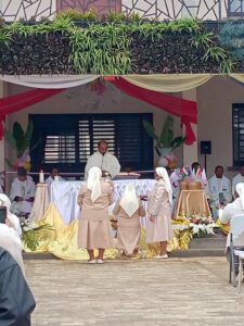 La cérémonie s’est déroulée à la Paroisse Sainte Famille d’Ambohimena Antsirabe, en présence d’une foule nombreuse de fidèles, rassemblés en ce dimanche, Jour du Seigneur. La veille, lors de la messe, les parents avaient donné leur bénédiction à leurs filles, et Sœur Flavie ainsi que Sœur Norine avaient renouvelé leurs vœux. Ce fut une grâce immense de voir l’Église vibrer de tant de ferveur et de joie.
